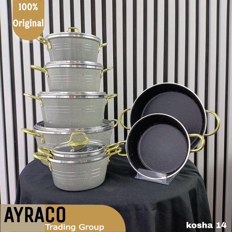اقلام موجود: ۶ قابلمه در سایزهای ۱۴، ۱۶، ۱۸، ۲۰، ۲۴، ۲۸ + ۲ تابه در سایزهای ۱۸ و ۲۸