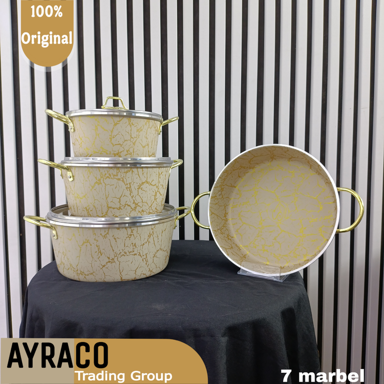 قابلمهها و تابههای این مجموعه از آلومینیوم فشرده با ضخامت بالا ساخته شده و پوشش داخلی آنها از نوع گرانیت ماربل نچسب است که مقاومت بسیار بالایی در برابر خط و خش دارد. این ویژگی باعث میشود حتی پس از استفاده مداوم، غذا به کف قابلمه نچسبد و تمیز کردن ظروف آسان باشد.