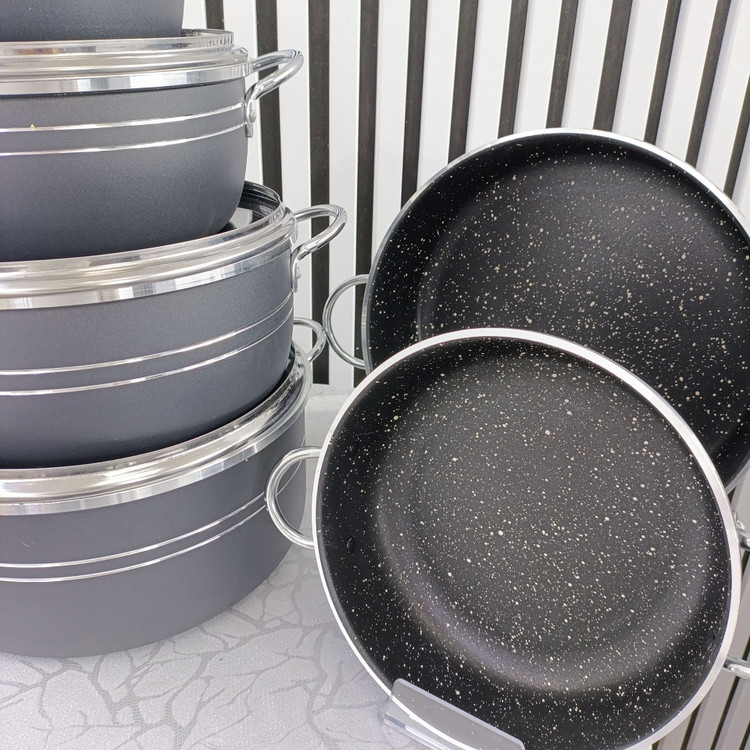 سرویس ۱۰ پارچه قابلمه اپیروس مشکی گرانیتی – مجموعه حرفهای قابلمه و تابه در سایزهای بزرگ و کاربردی